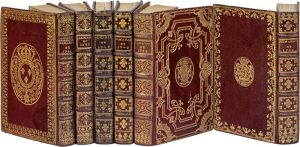 pour l'année 1742. Paris, Veuve d'Houry, 1742. In-8, maroquin rouge, large dentelle droite dorée, armoiries au centre, dos orné de fleurs de lis dorées, doublure et gardes de papier d'Augsbourg, tranches dorées (Reliure de l'époque). Très bel exemplaire en maroquin rouge aux armes royales de France. Calendrier interfolié.
