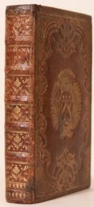 année 1764. Paris, Le Breton, 1764. In-8, maroquin fauve, plaque dorée, armoiries au centre, dos orné, doublure et gardes de soie rose, tranches dorées (Reliure de l'époque). Exemplaire en maroquin fauve orné d'une plaque à la Dubuisson, aux armes non identifiées.