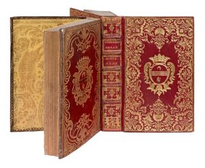 année 1775. Paris, Le Breton, 1775. In-8, maroquin rouge, large plaque dorée, armoiries dorées, dos orné de fleurs de lis dorées, doublure et gardes de soie bleue, tranches dorées (Reliure de l'époque). Bel exemplaire en maroquin rouge aux armes de Jean-Daniel Marquet de Montbreton, orné d'une plaque à la Dubuisson.
