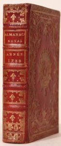 année bissextile 1788. Paris, d'Houry, 1788. In-8, maroquin rouge, plaque dorée, armoiries au centre, dos orné de fleurs de lis dorées, tranches dorées (Reliure de l'époque). Très bel exemplaire de maroquin rouge orné d'une plaque à la Dubuisson et aux armes de Louis-Stanislas-Xavier-François de France, comte de Provence et futur Louis XVIII (1755-1795).