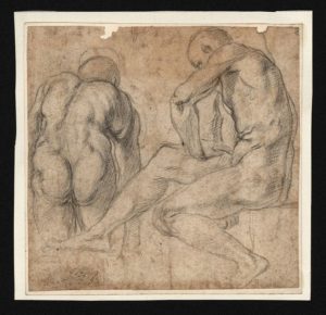 Études de deux hommes nus, l’un vu de dos et semblant se baigner, l’autre assis et de profil, tourné vers la gauche. Pierre noire (deux manques en haut). Avec un paraphe ‘JB’ (?) à la plume et encre brune, en bas vers la gauche (pas dans Lugt). 12,5 x 12,8 cm. Ce dessin peut être rapproché de deux figures du Baptême du Christ, une huile sur toile de petites dimensions (36 x 27 cm), signée et datée 1570, aujourd'hui conservée à la Galerie nationale de Prague (S. Lecchini Giovannoni, Alessandro Allori, Turin, 1991, no. 26). L'homme vu de dos du présent dessin semble être préparatoire à une figure vêtue d'un pantalon au premier plan à gauche du tableau de Prague, tandis que l'homme assis, cette fois en sens inverse et avec quelques différences de pose, y apparaît au deuxième plan à gauche. Simona Lecchini Giovannoni (op. cit.) signale une étude pour l'homme de dos aux Offices (inv. 10236F).