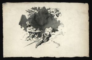 Soldat et femme nue. Pinceau et lavis d’encre de Chine. Signé de manière indistincte. 15,6 x 24,5 cm.