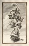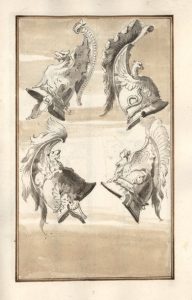 Album, petit in-folio, reliure cartonnée bleue comprenant 70 dessins représentant des trophées d’armes, des casques, des armes et armures. La plupart à la pierre noire, plume et encre noire, lavis brun et gris, inscrits dans des traits d’encadrement à l’encre noire, deux types de filigranes : trois croissants et chapeaux d’ecclésiastique. Avec inscription ‘voir Ceinture romaine après masses d’armes’ sur la couverture ‘ARMES’ sur la tranche ; avec des inscriptions indéchiffrables en italien (?) au verso de quatre dessins. 32 x 21 cm (feuilles) ; 22,5 x 13 cm (dimensions aux traits d’encadrement). Le style et la technique des dessins évoquent l’atelier de Giovanni Battista Tiepolo (1696-1770), une origine confirmée par le papier typiquement vénitien, épais et fortement vergé avec les caractéristiques filigranes trois croissants et chapeaux d’ecclésiastique.