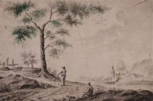 Couple et chien. 154 x 140 mm. Lavis brun et mine de plomb sur calque. Petites déchirures sur les bords.