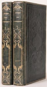 Lettres sur l'astronomie. Paris, Armand Aubrée, 1838. 2 volumes in-8, basane verte, plats ornés de décors frappés à froid, dos lisses ornés. (Reliure de l'époque). Troisième édition de cet ouvrage classique sur l'astronomie, illustrée de 2 planches dépliantes.