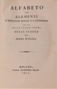 ed elementi d'istruzione morale e d'aritmetica ad uso della classe infima delle scuole del regno d'Italia. Milan, Stamperia reale, 1811. In-8, cartonnage de papier à la colle rose (Reliure de l'époque). Très rare manuel scolaire à l'usage des petites classes d'Italie.