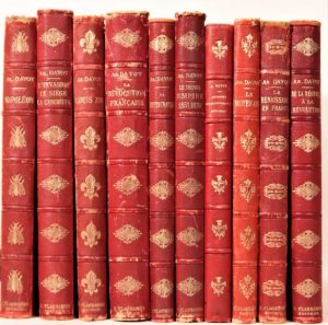 [L'Histoire de France par l'image]. Paris, Ernest Flammarion, s.d. [1895-1914]. 10 volumes in-4 oblongs, demi-chagrin rouge avec coins, illustration et titre dorés sur le premier plat (sauf un volume aux plats muets), dos orné, tête dorée (Reliure de l'éditeur). Série complète des dix volumes composant cette histoire de France illustrée d'innombrables reproductions en noir et blanc : Le Moyen Âge – La Renaissance en France – Louis XIV – De la Régence à la Révolution – La Révolution française – Napoléon – La Restauration – Journées révolutionnaires, 1830-1848 – Le Second Empire – L'Invasion, le Siège, la Commune.