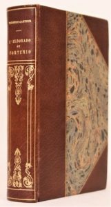 L'Eldorado ou Fortunio. Paris, imprimé pour les Amis des livres par Motteroz, 1880. Grand in-8, demi-maroquin fauve avec coins, filet doré, dos lisse orné en long, tête dorée, non rogné, couverture et dos (F. Durand). Édition de luxe illustrée de 12 eaux-fortes hors texte de Félix Milius et de 81 vignettes et lettrines de Paul Avril.