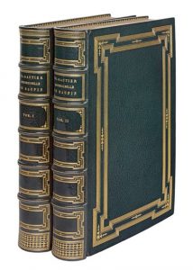 Mademoiselle de Maupin. Paris, L. Conquet, 1883. 2 volumes in-8, maroquin vert, double encadrement de cinq filets et pointillés dorés aux angles brisés sur les plats, dos orné de même, tranches dorées, chemises doublées et étuis (Cuzin). Édition ornée de 17 illustrations d’après Édouard Toudouze.