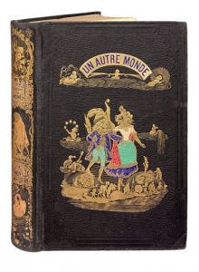 Un autre monde. Transformations, visions, incarnations, ascensions, cosmogonies, fantasmagories, lubies, métamorphoses, zoomorphoses, lithomorphoses, métempsycoses, apothéoses et autres choses. Paris, H. Fournier, 1844. Grand in-8, percaline gaufrée noire au décor polychrome et doré, dos lisse orné de même, tranches dorées (Reliure de l'éditeur). Édition originale du chef-d'œuvre de Grandville, illustrée d'un frontispice en noir, de 36 gravures hors texte en couleurs et de nombreuses vignettes in texte.