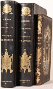 Scènes de la vie privée et publique des animaux. Paris, J. Hetzel, 1842. 2 volumes in-4, demi-chagrin noir avec coins, dos lisse orné de fers reprenant des illustrations de Grandville (Reliure de l'époque). Édition originale.