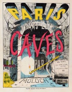 Paris dans les caves. Paris, Deforet & César, juin 1871. Grand in-4, en feuilles, sous chemise à lacets de l'éditeur. Rare recueil de caricatures sur le siège de Paris en 1870 illustré d'un titre-frontispice et de 39 illustrations en couleurs par Moloch.