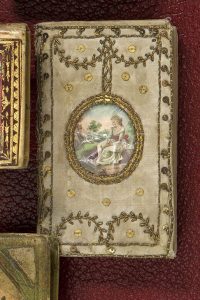 AMOUR (L’) parmi les jeux, Le Souvenir du bon temps. — Paris, Boulanger, 1785. — In-12, soie beige à décor brodé de filets et stilles dorés, au centre de chaque plat médaillon suspendu orné d’une gouache, au dos décor de croisillons,...