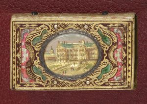 TRÈS CHARMANTE ET RARE RELIURE ornée de vues sur métal doré de Compigné, montrant l’une le château de Versailles et l’autre les Tuileries.