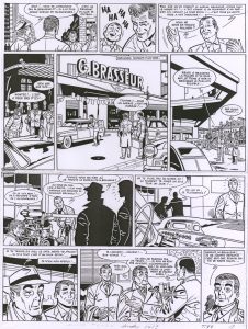REDING Raymond. Vincent Larcher Encre de chine noire pour la planche 37 de l’album Vincent Larcher avant-centre paru dans le journal Tintin en 1963 et en album aux éditions Bédescope en 1979. Nombreux croquis au dos, à la mine de plomb et au...