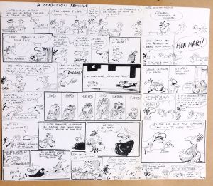REISER. La condition féminine.2 planches à l’encre de Chine sur papier épais pour une histoire complète publiée dans CHARLIE HEBDO. Formats 32,5 x 41 et 16 x 41 cm. Signée.