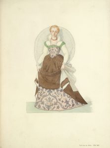 Les aquarelles sont montées sur onglets et représentent des personnages en costume anglais, allemand, italien, flamand, français, etc. Signalons parmi tant d’autres, un superbe portrait équestre de François Ier, en costume d’apparat.