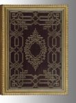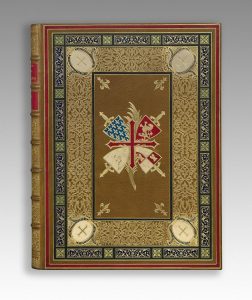 médaillon chargé d’une croix de croisé et fleur de lis aux angles, le centre occupé par un grand motif héraldique, dos lisse orné à la grotesque, pièces de titre et de tomaison rouges, dentelle intérieure, doublure de maroquin aubergine orné d’un important décor de filets et d’entrelacs dans le genre du XVIe siècle avec grand cartouche central, gardes de moire aubergine, tranches dorées, emboîtages modernes (Charles Magnier).