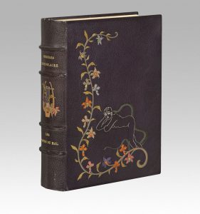 BAUDELAIRE (Charles). — Les Fleurs du mal. — Paris, Éditions du Cinquentenaire de Baudelaire, 1917. — Fort volume grand in-4, maroquin aubergine, sur le premier plat grande branche de fleurs au naturel tracée au trait d’or, les fleurs...