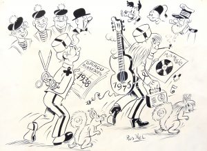 ROB-VEL. Spirou 1938-1975. Dessin à l’encre de Chine sur papier pour l’album LA NAISSANCE DE SPIROU des éd. Michel Deligne paru en 1975. Format 50 x 36 cm. Avec couleurs sur calque