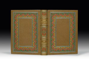 orné de même, encadrement intérieur orné de filets dorés et de listels bleus interrompus aux angles par un motif rouge, doublure et gardes de moire jaune paille, tranches dorées sur témoins, couverture et dos, étui (Ch. Septier).