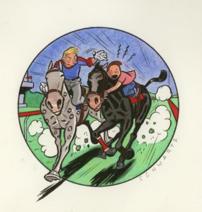 SCHWARTZ Olivier. Inspecteur Bayard Encre de chine et aquarelle pour la page de titre de l’album L’inspecteur voit rouge paru en 2001 chez Bayard Editions. Format du dessin : 10,5 x 11,5 cm. Signé.