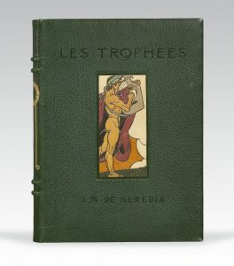 HEREDIA (José Maria de). — Les Trophées. — Paris, Imprimé pour le compte de M. Descamps-Scrive, 1907. — Grand in-4, maroquin vert foncé, encastrée dans le premier plat figure d’un poète antique de maroquin mosaïqué et modelé en...