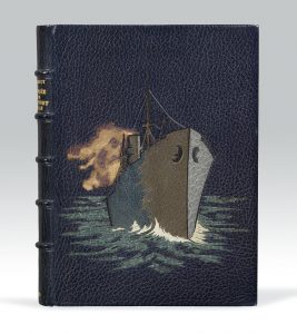 RELIURE DE CHARLES LANOÉ DONT LES COMPOSITIONS MOSAÏQUÉES SUR LES PLATS ÉVOQUENT LE DESTIN TRAGIQUE DU TORPILLEUR LE PAMIR.