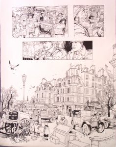 STALNER Eric. La Croix de Cazenac Encre de chine noire pour la planche 8 de l’album LA MARQUE DU LOUP paru aux éd. Dargaud en 2003. A noter que la grande case du bas a servi de 4°de couverture à l’album. Format 50 x 37,5 cm.