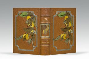 feuillages et de fruits au naturel mosaïquée en divers tons (ocre, brun et vert olive), dos à quatre nerfs portant le titre doré, rappel du décor du premier plat dans le caisson central, deux doubles filets intérieurs, doublure et gardes de soie brochée, tête dorée, non rogné, couverture et dos, étui (René Kieffer).