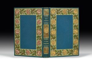 SCHULZE (Ernst). — La Rose enchantée. — Traduction de E. Laforgue. — Paris, Édition Boudet, s.d. In-4, maroquin bleu canard, large bordure de maroquin gris sertie d’un filet doré, dans laquelle courent 12 roses mosaïquées en guirlande...