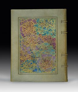 VERLAINE (Paul). — Fêtes galantes. — Paris, Helleu, 1919. — In-8, maroquin vert céladon, sur les plats grande pièce de cuir ornée d’un décor de fleurs pyrogravé et doré, puis peint dans des nuances de mauve et de bleu, dos à nerfs...