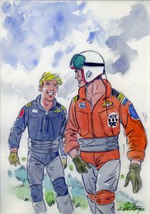 WEINBERG Albert. Dan Cooper Aquarelle pour une illustration inédite de Dan Cooper et un ami. Format : 21 x 29,7 cm. Signé.