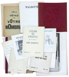 Et: 19 cat. d'expo/ invitations et une affiche (The 8 sculptures of Magritte, Hannover Gallery, 1968) au sujet de la vie et de l'oeuvre de René Magritte.
