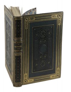 Rel. en plein mar. vert, plats ornés d'une triple encadrement de filets dorés et petits fers aux angles, grand plaquet rectangulaire central à froid et pointillé doré ainsi imitant un décor 'à la cathédrale', dos lisse orné d'un décor à froid et pointillé doré, coiffes guillochées et coupes avec roulette dorée, tête dorée, couverture (De Samblanx, selon une note).