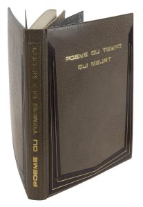 Rel. orig. doublé en plein mar. gris souris, bordée sur les plats d'une composition géométrique de mar. brun foncé mos. et orné de deux filets dorés, dos lisse, int. encadrement d'un listel mos. de mar. brun foncé et un double enc. de listels dorés, gardes de soie grise brodée ......., tranches dorées sur témoins (A. Toumaniantz).