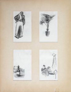 HENRI EVENEPOEL (1872-1899) — Études d'un garçon, d'une plante, d'une bouteille et de personnages. — Crayon. — Tous montés sous un passe-partout. 155 × 85 mm (×4)