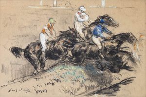 FRANZ CHARLET (1862-1928) — Jockeys à la course d'obstacles. — Crayon noir et vert, gouache. — Signé. — Encadré. 300 x 465 mm (565 x 695 mm)