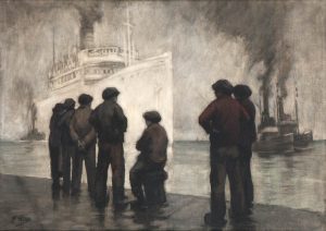 KURT PEISER (1887-1962) — Dokwerkers op de kade bij de aankomst van een stoomschip.