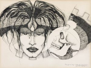 JEF VAN TUERENHOUT (1925-2006) — 'Langs de weg, waken de oude Goden'. — Encre de Chine. — Signé à la mine de plomb 'Jef Van Van Tuerenhout' et titré. — Encadré.— 480 x 650 mm (740 x 905 mm)