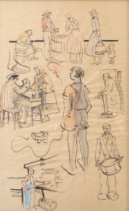 Zwarte stift en kleurpotlood op bruin papier. Getekend in zwarte bic 'Jef Geys' en genummerd '121'.