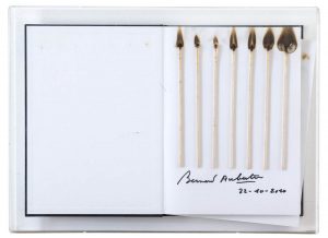 Zeven ontbrande lucifers gekleefd op blad. Getekend en gedateerd in zwarte stift 'Bernard Aubertin/ 22-10-2010'.
