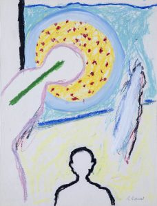 Gemengde techniek (vetkrijt, acryl) op papier, gemaroufleerd op paneel.