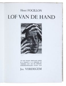 JOS VERDEGEM (1897-1957) — 'Lof van de Hand', 1952. — Farde contenant 26 eaux-fortes de Jos Verdegem. — Bruxelles, De Lijn 1952. — Tir. lim. et num. 23/25. — Toutes signées et numéroteés à la mine de plomb. — En ff. sous box d'éd.