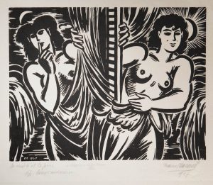 Houtsnede op fijn oosters papier. Gemonogrammeerd en gedateerd in het blok. Getekend en gedateerd in potlood 'Frans Masereel / 1947', eigenhandig getiteld, met annotatie 'EP. hors commerce', met handgeschreven opdracht: 'a Maurice Naessens / FM.'.