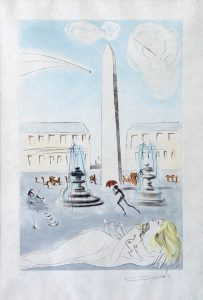 SALVADOR DALI (1904-1989) — 'Gala et l'obelisque de la Concorde' (1963). — Eau-forte en couleurs. — Signée au crayon 'Dali' et numérotée XVIII/L. — De la série 'Paris' de 1963. — Encadrée. — 570 x 375 mm