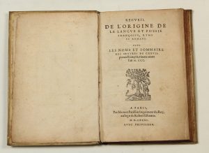 [FAUCHET (Claude)]. — Recveil de l’origine de la langve et poesie françoise, ryme et romans. — Plvs les noms et sommaire des œvvres de CXXVII. poetes François, viuans auant l’an M. CCC. — A Paris, Par Mamert Patisson Imprimeur du Roy,...