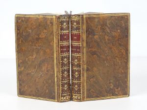 havane jaspé (mors frottés et le 1er du tome I partiellement fendu) - Plats encadrés d’1 triple filet doré - Filet aux coupes - Dentelle intérieure - Dos lisses ornés (petit accroc en coiffe supérieure du tome II) - Pièces de titre et de tomaison maroquin bordeaux - Tranches dorées - Le tome I porte la mention manuscrite « Cet exemplaire m’a été donné par M. Diderot le 20 juillet 1782 » à l’encre noire en bas de la 3ème garde blanche. Il s'agit de la deuxième collective dramatique de Diderot à paraître de son vivant, la première étant de 1759 et portant l'adresse d'Amsterdam. L'ouvrage contient les deux pièces Le Fils naturel (volume I) et Le Père de famille (volume II), suivis de deux discours sur le système dramatique (celui du volume II adressé à Grimm).