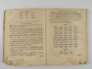 et 1 importante galerie de ver, toute fois sans atteinte au texte, quelques passages soulignés, quelques annotations anciennes en marge, feuillet des pages 17-18 déchiré sans perte - Ouvrage en langue latine et arabe - Reliure de l’époque (1ère moitié du XVIIème siècle) vélin ivoire rigide (manques en bas du 1er plat ainsi qu’aux 2 coins inférieurs - Rare. Ouvrage vendu en l’état.