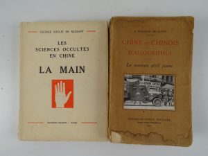 contre collée au 1er plat (auréolée avec manque, 2nd plat détaché) - Frontispice - Ex-libris de Christian Fouanon gravé par Hélène Hué, représentant un fumeur d’opium allongé dans un décor de fleurs de pavot et de livres, surmonté de l’œil de l’ophtalmologiste, signé au crayon et numéroté 85/100 - SOULIÉ DE MORANT (George) - Les sciences occultes en Chine. La main - Paris ; Éditions Nilsson, sans date [vers 1930] - 1 volume In-8° broché (dos en partie recollé) - Des figures in et hors texte, 1 index chinois in fine.